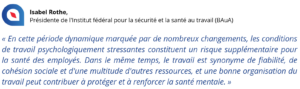 Selon la ministre fédérale du Travail et des Affaires sociales Bärbel Bas, « les maladies psychiques restent l’une des causes les plus fréquentes de départs à la retraite anticipés et la troisième cause d’incapacité de travail […]. Cela représente une charge énorme pour les personnes concernées et pour les entreprises. ».