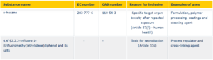 Après le décabromodiphényléthane (DBDPE) en novembre dernier, l’Agence européenne des produits chimiques (ECHA) a identifié le n-hexane ainsi que le bisphénol AF et ses sels comme des substances extrêmement préoccupantes (substances of very high concern – SVHC) susceptibles de nuire à la santé humaine ou à l’environnement.